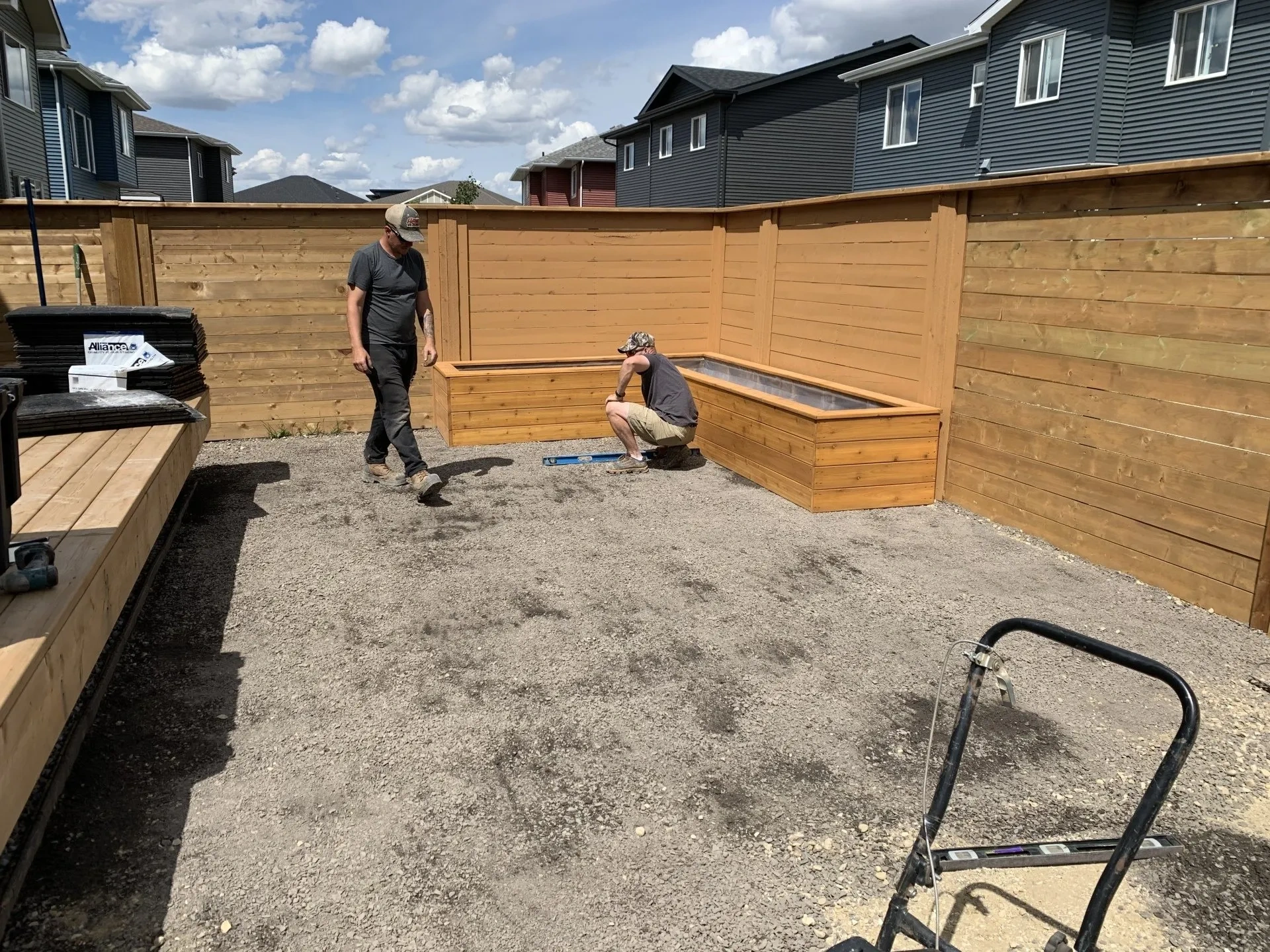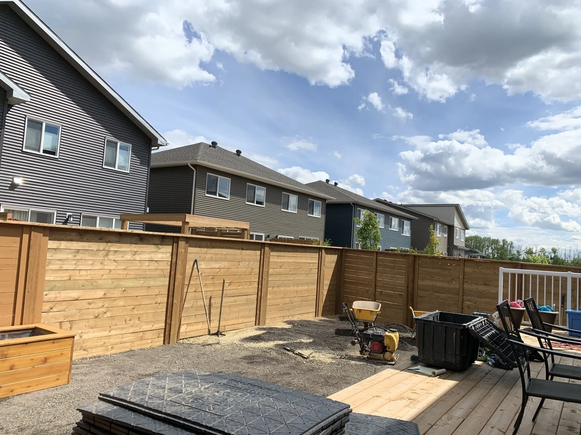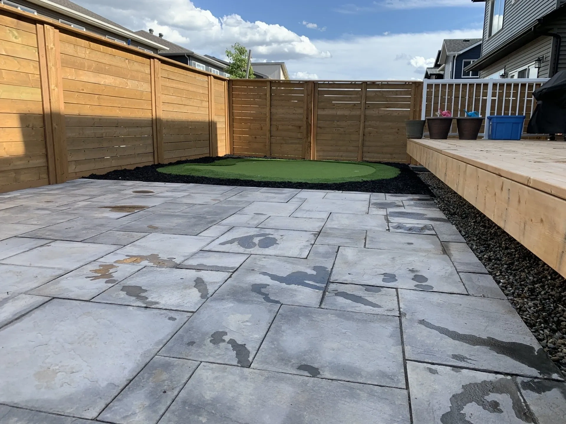 This job was completed in June 2019 and consisted of a small back yard, Bella turf putting green, Dimensional Flagstones from Barkman & Xeriscape front yard.